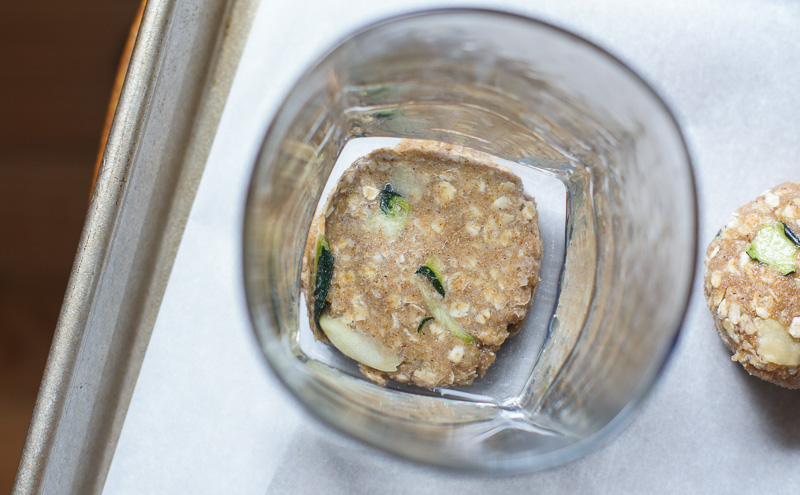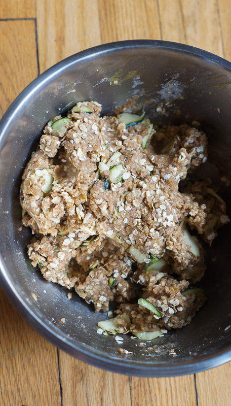 Second, cut in the shortening. This means to mix the fat with the dry ingredients. You can use a fork, a pastry cutter, or your hands! Beat in egg until well combined. (I added an extra egg because my mixture was a bit too crumbly.  I was confident that it wouldn’t make the cookies too cakey.  They turned out fine).   Add zucchini and oats and beat until evenly mixed in.  You can try giant slices of zucchini like I did here in the photos, or dice them up as tiny as you’d like.  I’ve also pureed them, but the mixture was TOO wet at that point and had to add back in oats and flour 😦  )